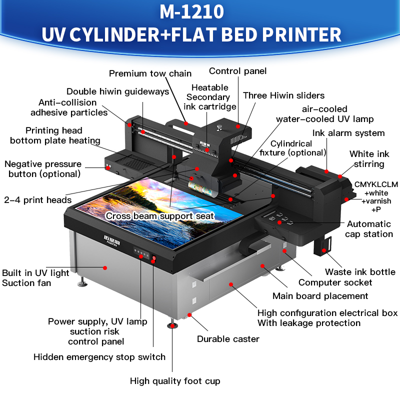 Modelo MSERIN 1210 (cabezales de impresión opcionales: Ricoh GH2220, Toshiba CE4, Epson 3200): Tiene un formato de impresión de 1.2m × 0.96m. Se puede equipar con dispositivos de sujeción para impresión cilíndrica y dispositivos de sujeción para impresión UV DTF, adecuado para procesamiento de impresión en lotes. También se puede equipar con función de posicionamiento visual CCD para reducir el tiempo empleado en el posicionamiento de la impresión.