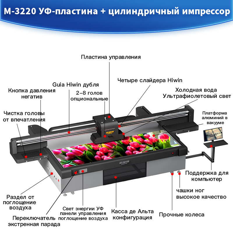 M-3220 плоскі + цыліндрычны друк УФ-прынтэр